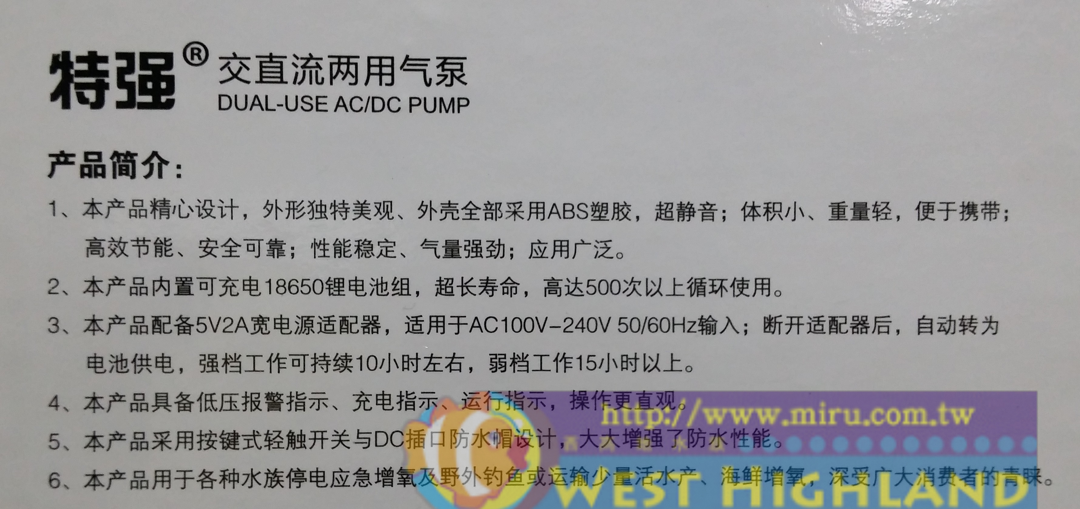 1.本產品精心研究設計,外型獨特美觀、外殼採用ABS工程塑料。 2.出氣大,氣量強勁,性能穩定,高效節能,安全可靠,方便攜帶, 應用廣泛。 3.內置可充電 6V 10AH鉛酸蓄電池,超長壽命, 可循環使用高達300次以上 4.交直流雙用,直接插入AC110-220V 50/60H 交流電即可使用, 無須關機充電 持有保持電池電量,斷電時自動轉會為電池供電, 最大氣量可連續工作10~12小時 5.產品採用高性能微處理芯片,具低壓警告,低壓保護功能, 完善的電池充放電保護電路,避免電池過充、 過放,有效延長電池使用壽命。 6.產品設計新穎,採用輕觸式按鍵控制,氣量大小6檔可調, 具記憶功能,每次打開即是上次關機時的檔位,無須重複調整。 |