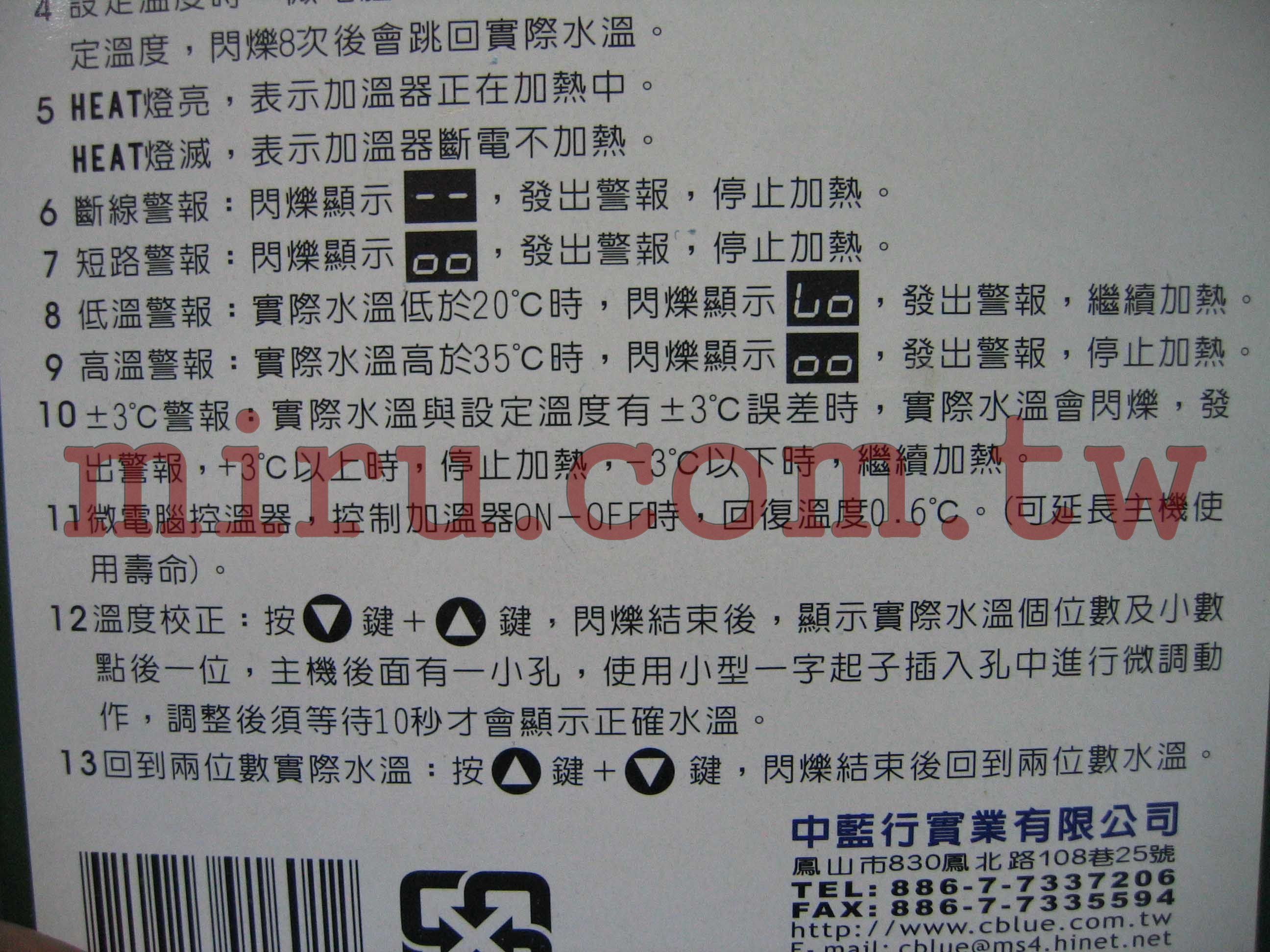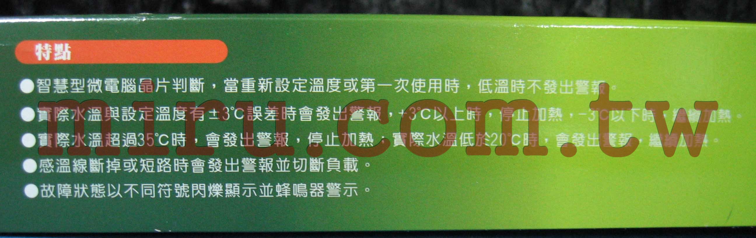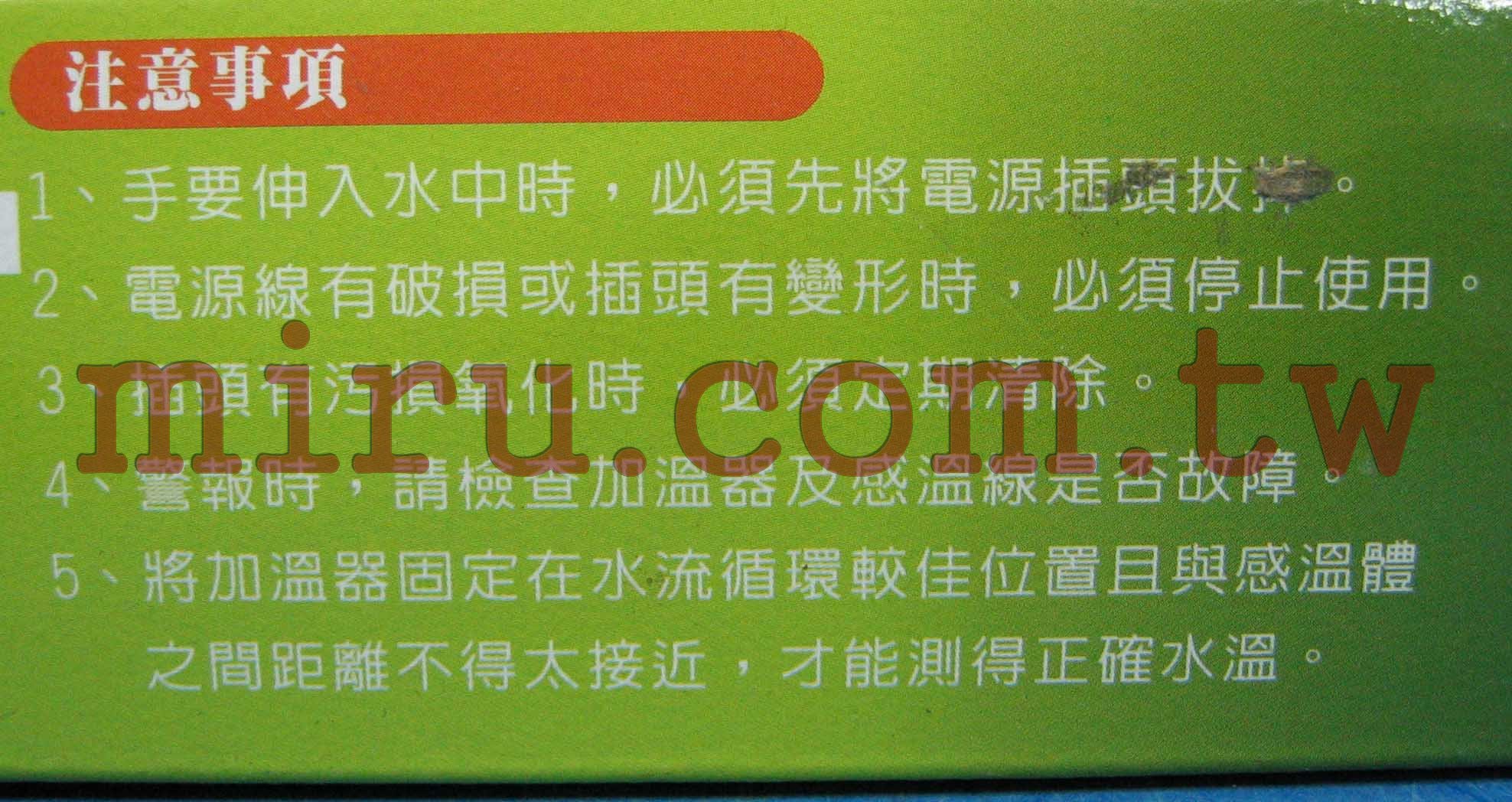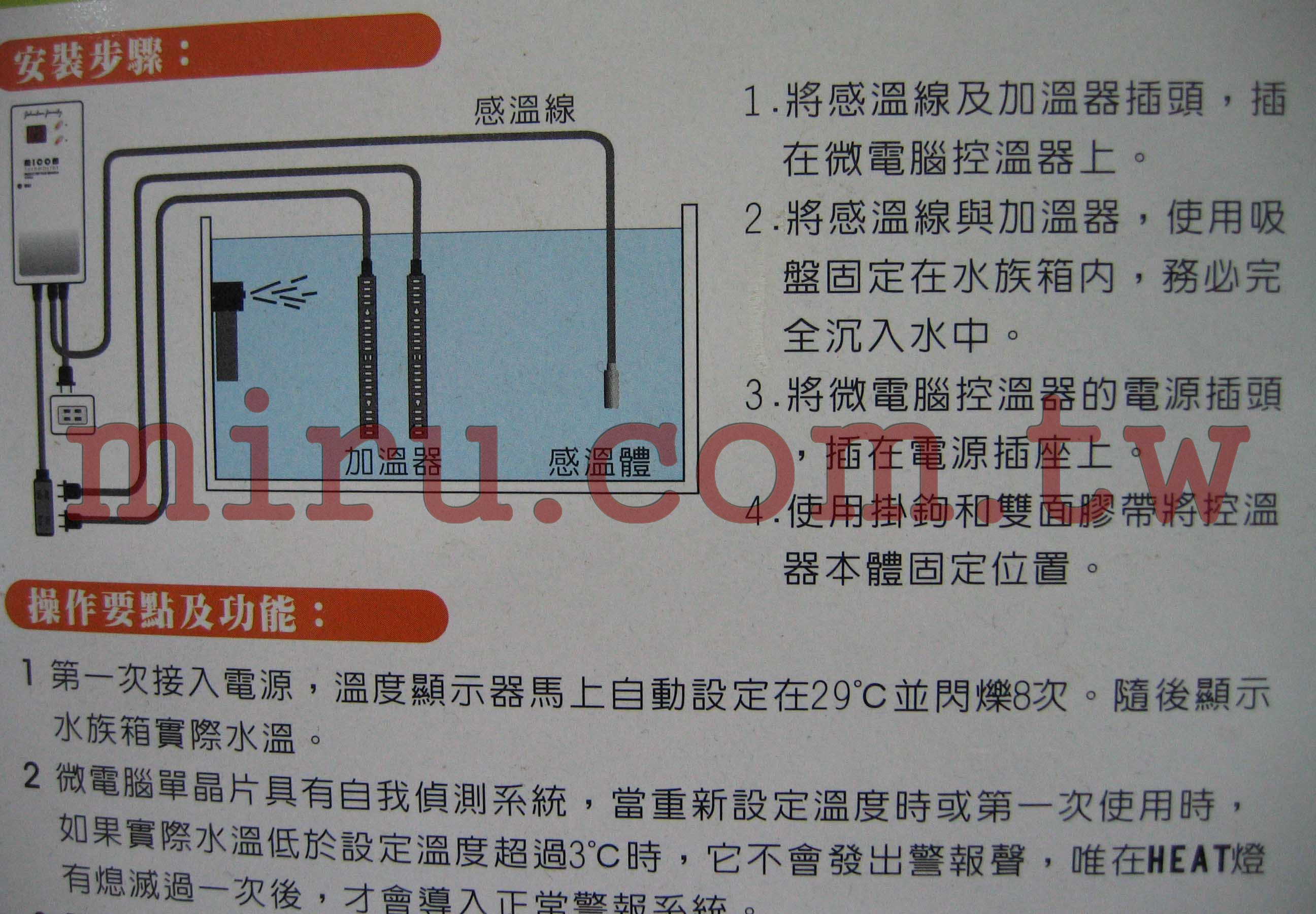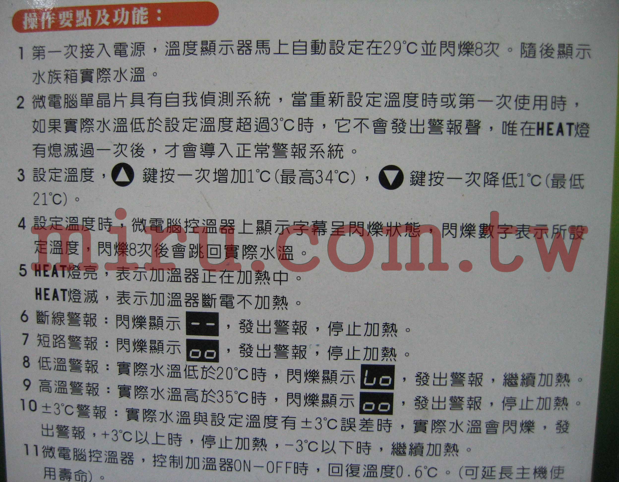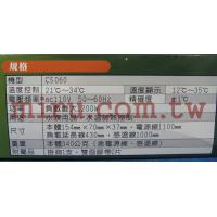 溫度控制:21~34℃ 溫度顯示:12~35℃電壓頻率:AC110V 50~60Hz 功率:負載最大1200w 用除:水族用品,水溫加熱控制。 尺寸:控溫器15.4*7*3.7cm 電源線110cm 負載延長線43cm 感溫線100cm 重量:約340g |