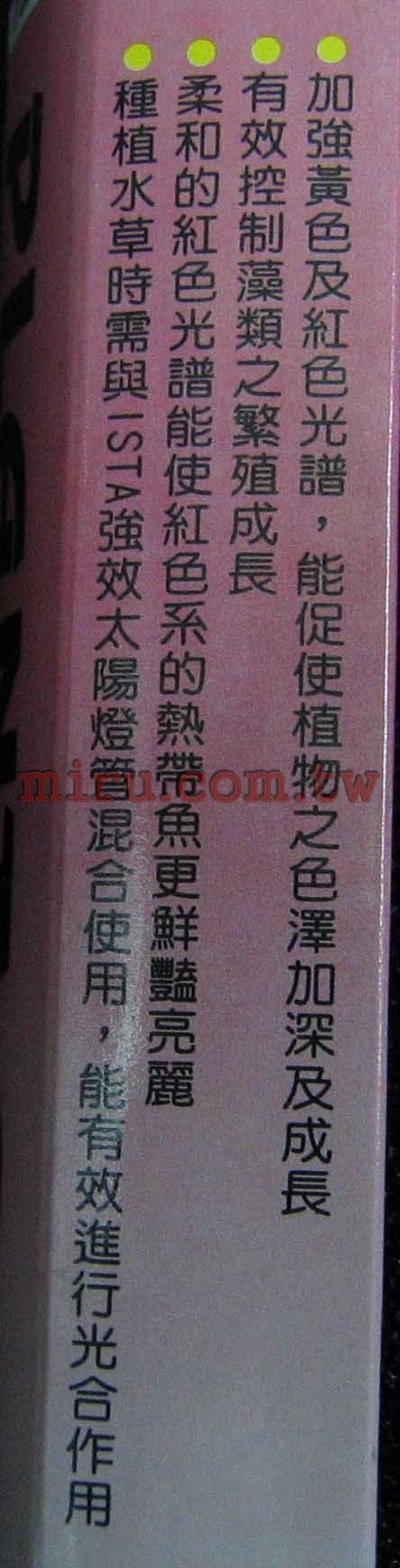 加強黃色及紅色光譜,能促進植物之色澤加深 及成長有效控制藻類之繁殖成長 柔和的紅色光譜能使紅色系的熱帶魚更鮮豔亮麗種植水草時需與ISTA強效太陽燈管混合使用,