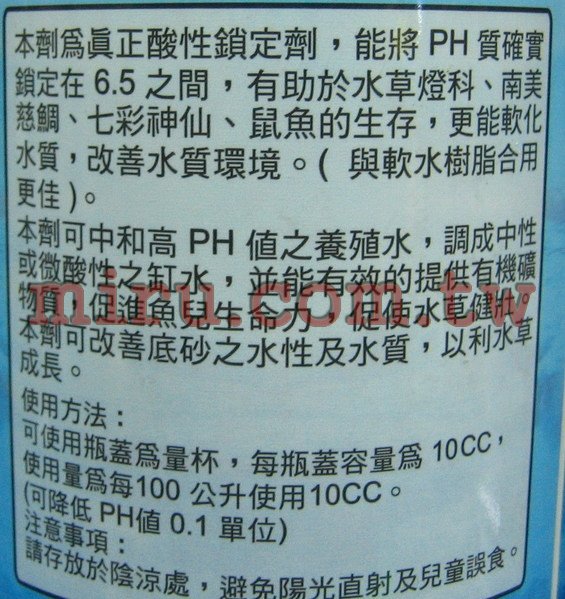 本劑可中和高pH值之養殖水,調成中性或微酸性之水質, 並能有效的提供有機礦物質,促進魚兒生命力,促使水草健壯。 本劑可改善底砂之水性及水質,以利水草成長。 能將 ph質確實鎖定在6.5之間,有助於水草燈科、南美慈鯛、 七彩神仙、鼠魚的生存,更能軟化水質,改善水質環境。 (與軟水樹脂合用更佳)。