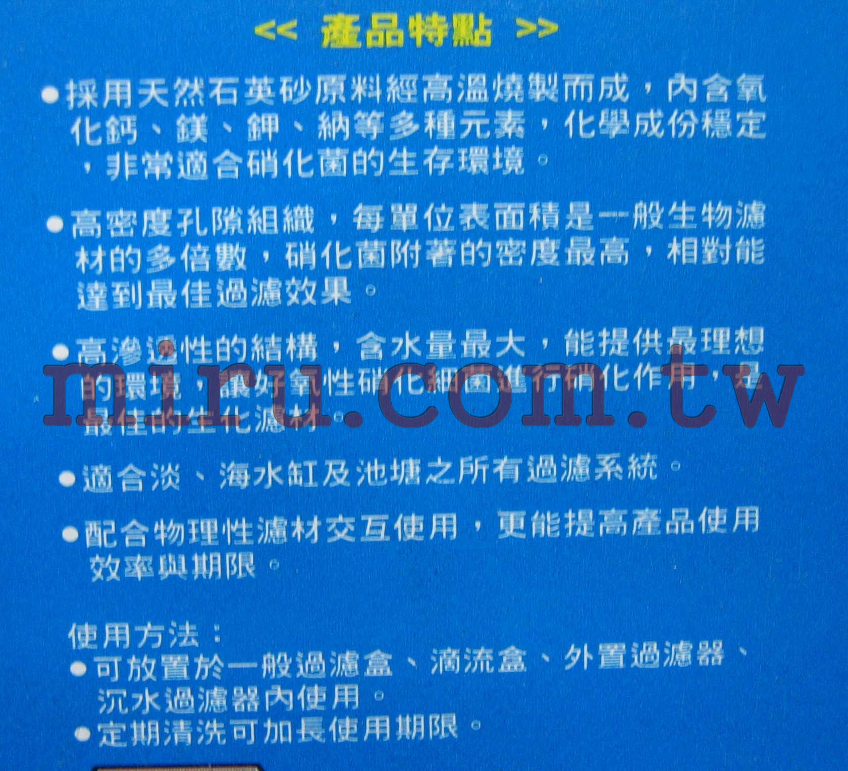 1.採用天然石英砂原料經高溫燒製而成,內含氧化鈣 鎂 鉀 納等多種元素, 化學成分穩定,非常適合硝化菌的生存環境!! 硝化菌附著的密度最高,相對能達到最佳過濾效果 讓好氧性硝化細菌進行硝化作用,是最佳的生化濾材 |
