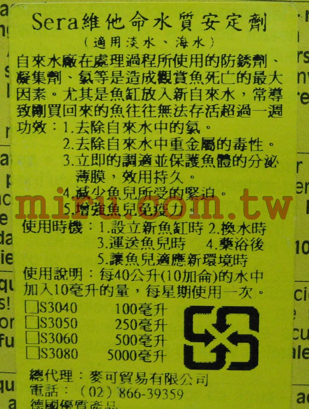 > 藥水,測試劑,水質處理,營養添加劑 > 水質處理劑> > 水質穩定劑 > 德國Sera 維他命水質安定劑,維他命水質穩定劑 5000ml