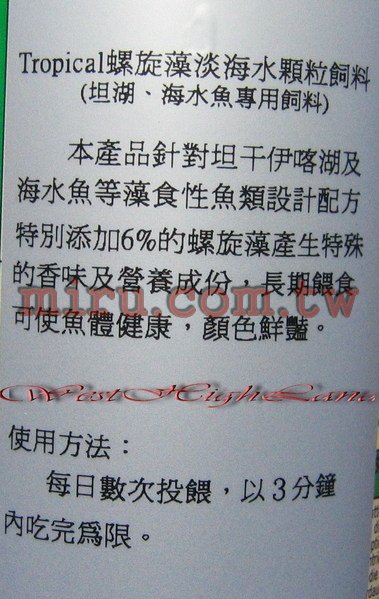 本產品針對坦干伊喀湖及海水魚等藻食性魚類設計配方, 特別添加 6% 的螺旋藻產生特殊的香味及營養成分, 長期餵食可使魚體健康,顏色鮮豔 |