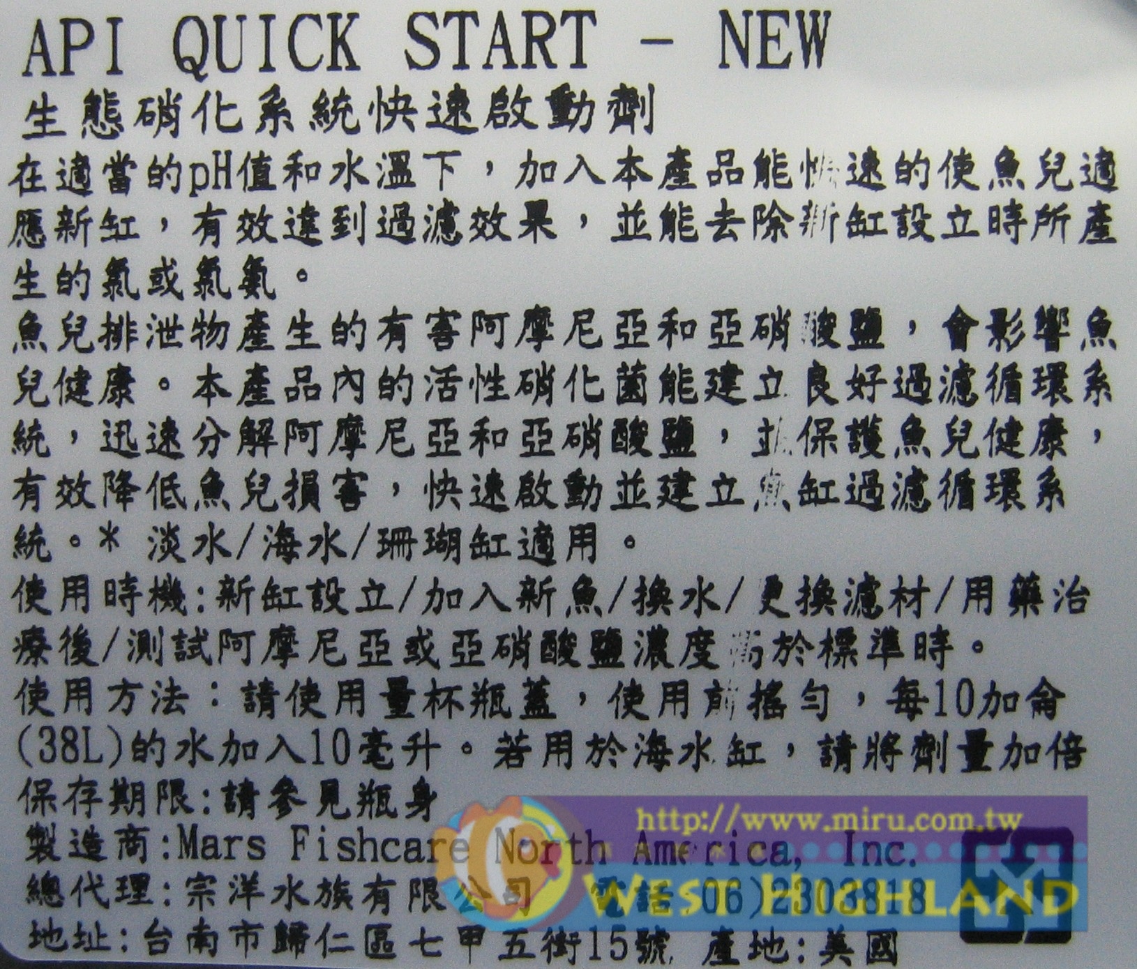 在適當的PH值和水溫下,加入本產品能快速地使魚兒適應新缸,有效達到過濾效果並能去除新缸建立時所產生的氯或氯胺。 在適當的PH值和水溫下,加入本產品能快速地使魚兒適應新缸,有效達到過濾效果並能去除新缸建立時所產生的氯或氯胺。 使用時機: 新缸設立/加入魚兒/換水/更換濾材/用藥治療後/測試阿摩尼亞和亞硝酸鹽濃度高於標準時。 |