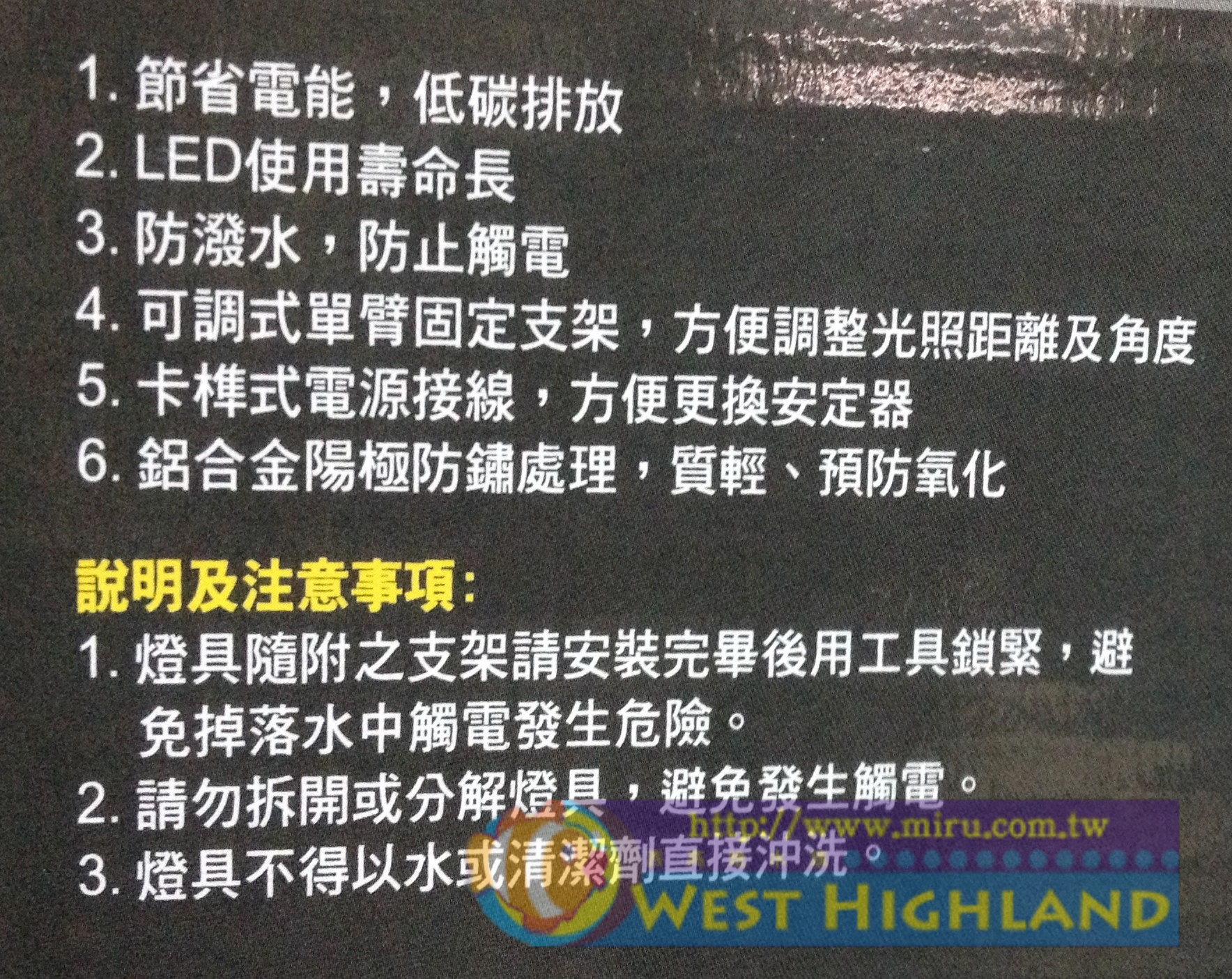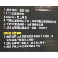 1.高效能省電LED燈泡. 2.防潑水設計,防止觸電. 3.可掀式固定腳架,方便移動及保養魚缸. 4.卡榫式電源接電,方便更換安定器. 5.鋁合金陽極防鏽處理,質輕、預防氧化. 6.可調式單被固定支架,方便調整光照距離與角度 7.採用安規認證零組件,燈具組通過台灣CNS R31589安規認證 |