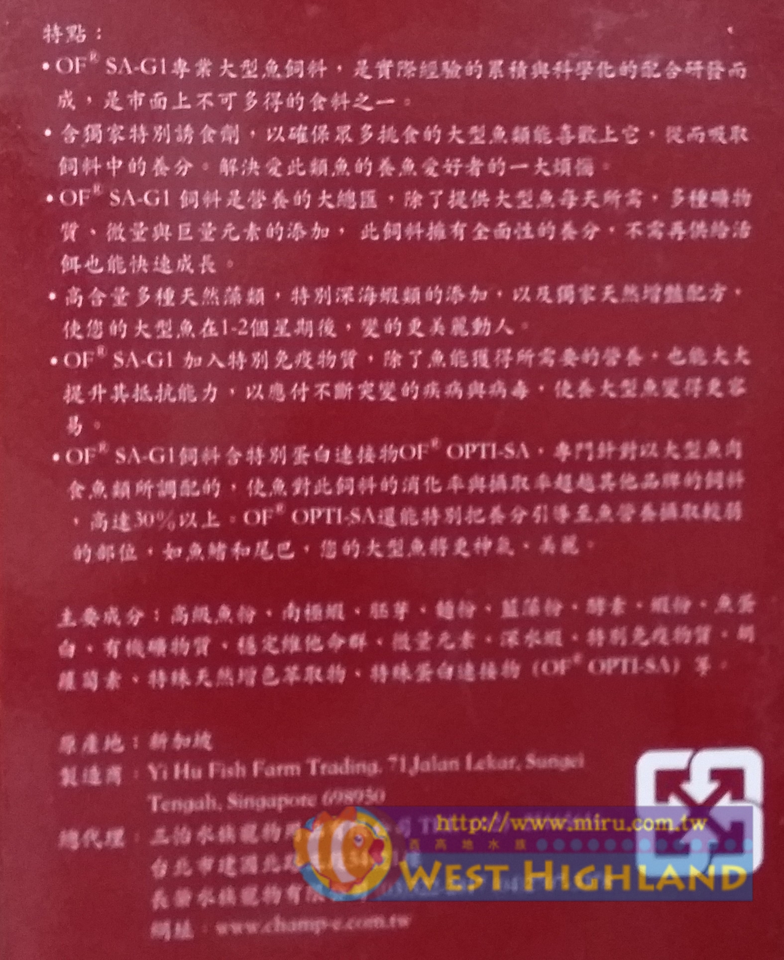 傲深SA-G1龍魚專用高級飼料(也適用於其它肉食性魚類食用, 如:泰國虎、血鸚鵡、皇帝魚、亞馬遜鴨嘴魚等), 提供高於龍魚日常所需的一切營養,非一般龍魚專用飼料所能及。 運用仟湖龍魚飼養場做實地深入研究,且用高端科技對龍魚 習性進行全方位的分析。其中包括嗜口性、營養的吸收性、 飼料的轉化率、龍魚的新陳代謝、體型、色澤和龍魚基因數據 (全球首家)等,經過反復試驗,精選高檔原材料,成功研發出獨一無二、 萬眾期待的傲深AR-G1龍魚專用高級飼料。 此飼料比活餌更經濟、更方便、更安全(它無細菌與寄生蟲), 營養也更全面,養分更容易被龍魚所吸收。傲深AR-G1龍魚專用高級飼料, 將全面造福於龍魚飼養者。 特點: 含特殊OF®-Opti AR:增加嗜口性,促進成長,提升健康,降低死亡率, 提高糧食轉化率,縮短食料轉換期。 強化抗菌與抗寄生蟲能力。 並能促進新陳代謝。 能充分被龍魚消化並吸收。 大量減少了排泄物,水質更潔淨。 D3-鈣、穩定維生素群、精選礦物群、深海魚油(含多種 歐美加3、6、9等脂肪酸)、穩定維他命C、膽鹼等。 |