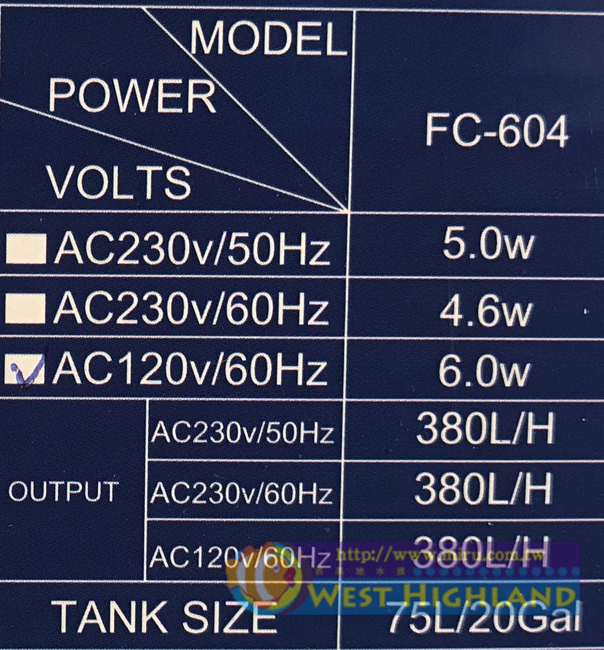尺寸-約 130 X 70 X 190 mm 耗電量:6W 水流量: 380 L/H 適合魚缸: 75 L 以下 最低可使用水位: 約 9 cm |