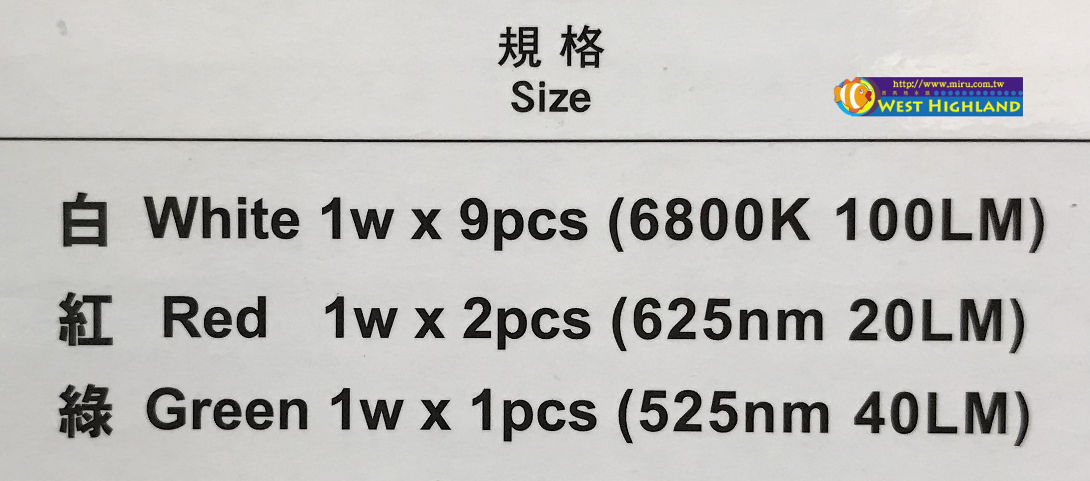 適用魚缸: 19cm-27cm 最大功率: 12W 電流:80ma 規格: 白White 1 W X 9 pcs ( 6800 K 100LM 紅Red 1w*2pcs(625nm 20LM) 綠Green 1W*1PCS(525nm 10LM) |