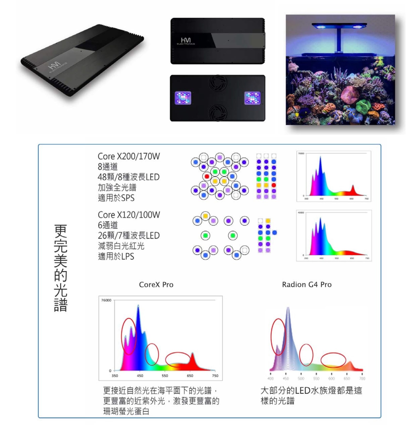 適用於LPS 1.輕薄時尚 ,厚度僅有1.8cm。更輕薄,重量僅有1.3kg。 2.玻璃承重更小,藏線溝槽設計,更美觀。 3.雙燈距離更遠,覆蓋面積更大,PAR更均勻。 4.全新設計的非球面光學透鏡+反光杯,提升30%的PAR Value, 降低50%的側光,適用1.5~3尺缸。 5.可靠度更高,雙風扇散熱系統,IP66防水防塵,高效率的導熱系統。 6.採用最新CREE/OSRAM LEDs 符合美國LM80 LED光衰標準 , 光衰<10% 使用5年,實際僅使用最大功率的80% 7.沿用魔塊app,不用重新下載,打開直接藍芽連接。 8.支架改背夾式,魚缸上方空間更大。