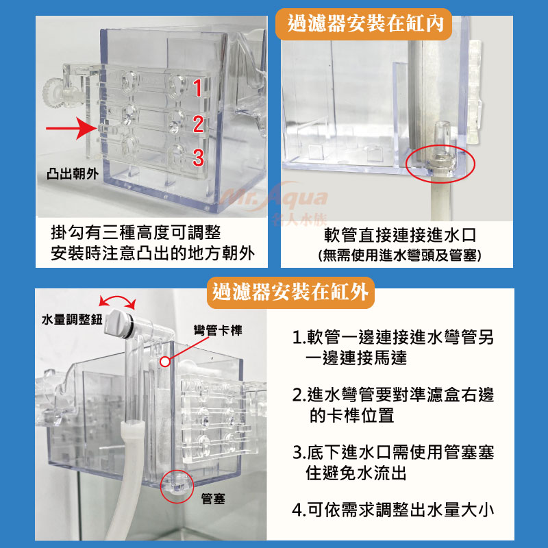需求放置多種濾材,淨水效果更好。 3.靜音運轉,節能省電。 4.可調整安裝位置(缸內或缸外),滿足不同空間需求。 ★本產品不含濾材,需自行加購。