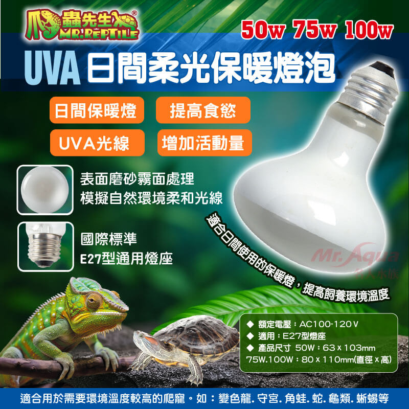 1.適合日間使用的保暖燈,提高飼養環境溫度 2.表面磨砂霧面處理,模擬自然環境柔和光線 3.提供爬寵日常所需的UVA光線,可促進爬寵食慾、