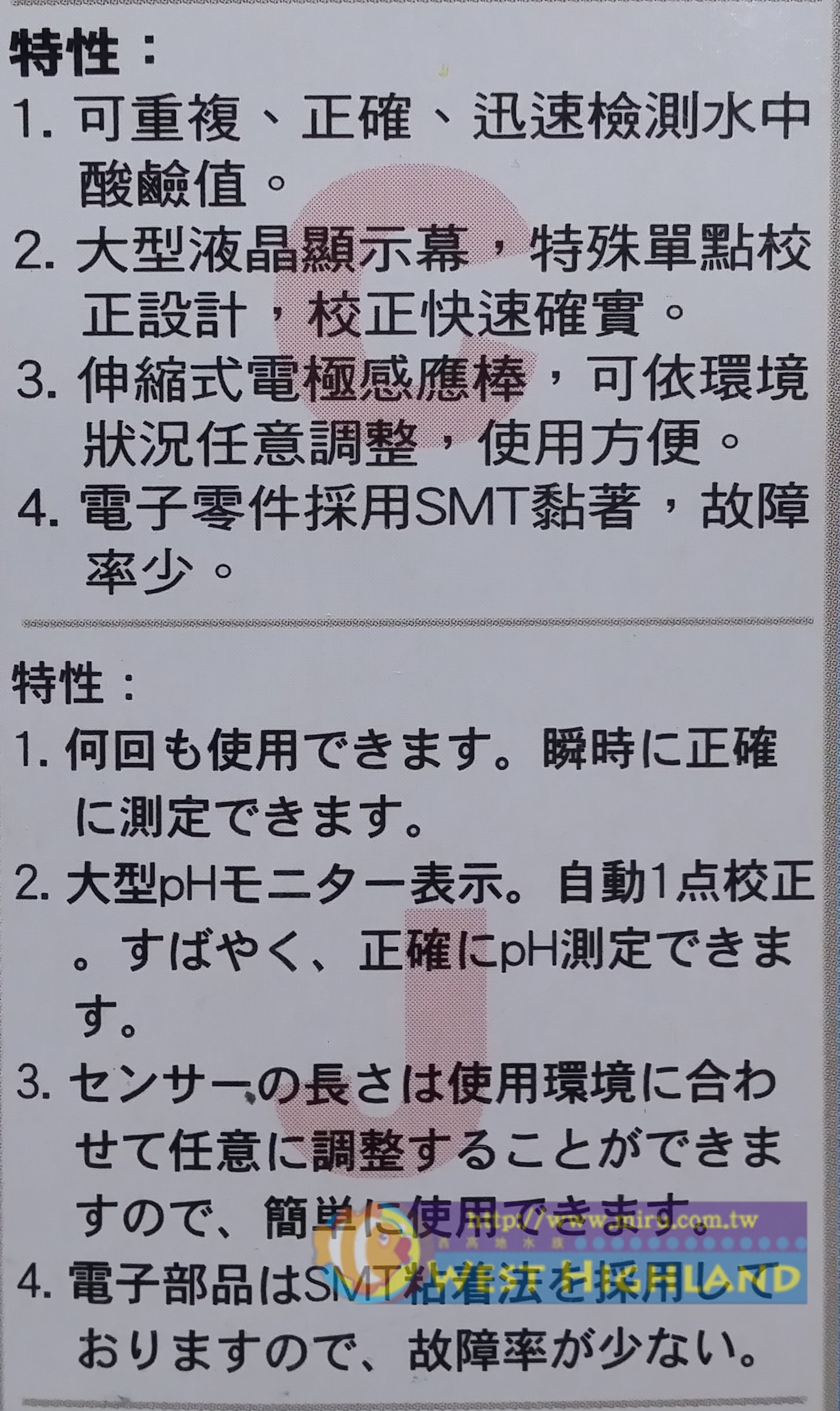 | 商品說明 | 1. 特殊單點校正設計,校正迅速確實。大型液晶顯示,觀測清楚容易。 2. 伸縮式電極感應棒,可依狀況任意調整,使用非常方便。 3. 電子零件採用SMT粘著,故障率少。 4. 9V方型電池,使用壽命長。精美塑膠外殼,攜帶或保存皆適宜。 |
