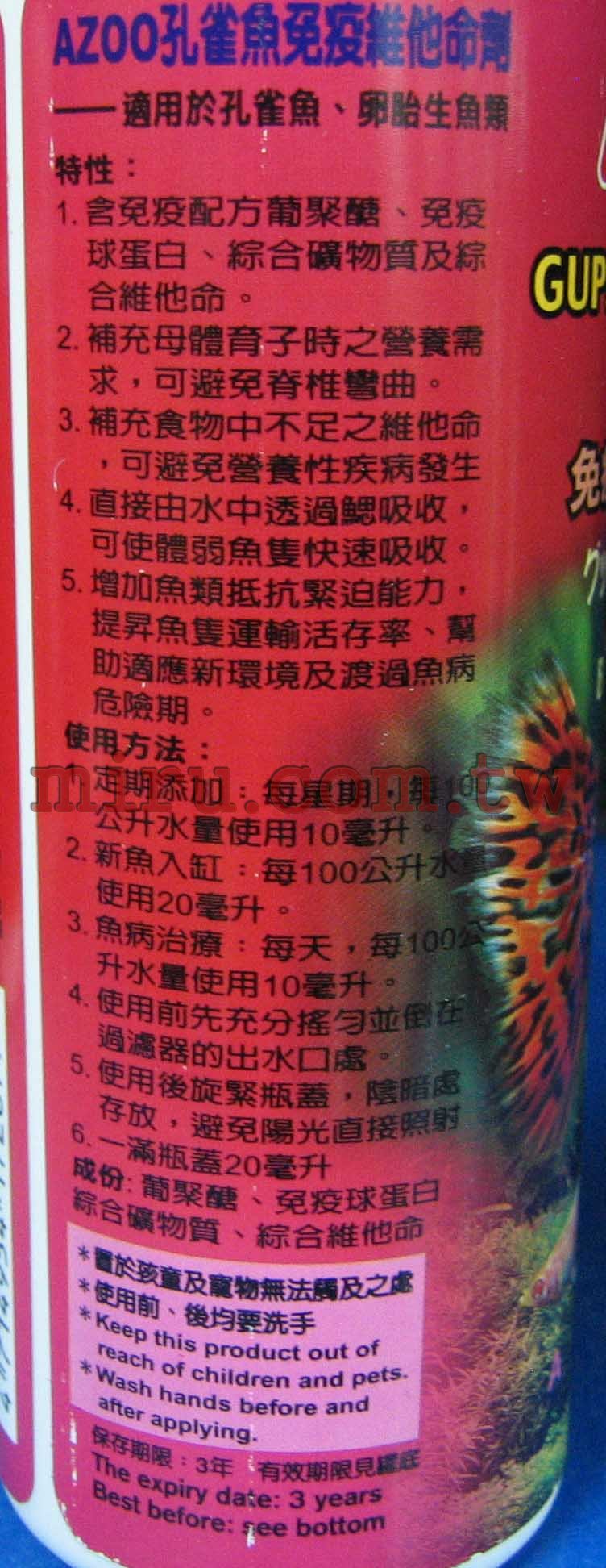 > 藥水,測試劑,水質處理,營養添加劑 > 營養添加劑> > 營養補充劑 > AZOO 孔雀魚免疫維他命劑(250ml)
