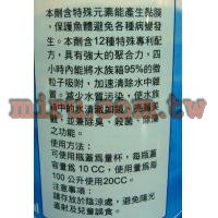 本劑含特殊元素能產生黏膜,保護魚體避免各種病變發生。 本劑含12種特殊專利配方,具有強大的聚合力, 四小時內能將水族箱95%的微粒子吸附,加速清除水中雜質。 減少水質污染,使水族箱中的水清澈如鏡、 亮麗美觀,並兼除臭、殺菌、除藻之功能。