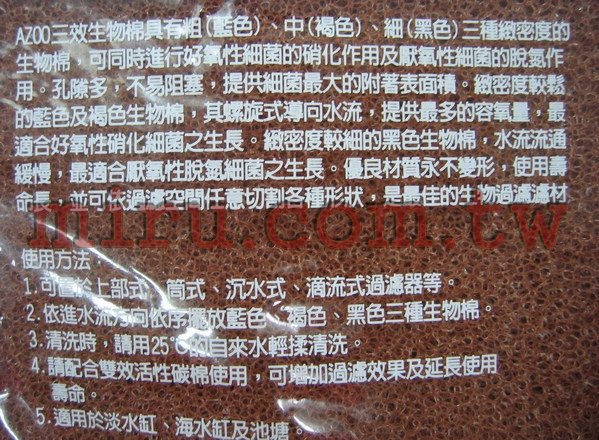 AZOO雙效活性碳棉具有活性碳棉及過濾棉兩種濾材, 可同時進行化學性及物理性過濾作用。活性碳棉是以不織布為基材,以特殊製程塗佈活性碳顆粒而成,活性碳含量高達60 %以上,可有效去除水中的異味及黃色物質,以及吸附自來水的殘留氯、有機酸及臭氣等。過濾棉亦以不織布為材質,可吸附水中大型懸浮粒子及碎屑,有效潔淨水質,增加水中的透明度。 |