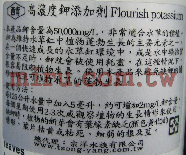 本產品鉀含量為50,000mg/L,非常適合水草的種植。 鉀為維持水草缸中植物蓬勃生長的主要元素之一。 在一個快速成長的水草缸環境中,或是水中礦物質 含量不足時,鉀就會被使用耗盡。 在這種情況下,很容易阻礙植物生長。 使用本產品來避免缺鉀的情形出現並可維持水草的蓬勃生長。 使用方法:每125公升水量中加入5毫升,約可增加2mg/L鉀含量。 每個星期使用2-3次或觀察植物的生長情形來使用。 缺鉀時,植物的新芽會有葉綠素缺乏(顏色黃化)的情形、葉片枯黃或枯死、細弱的根及莖。 |