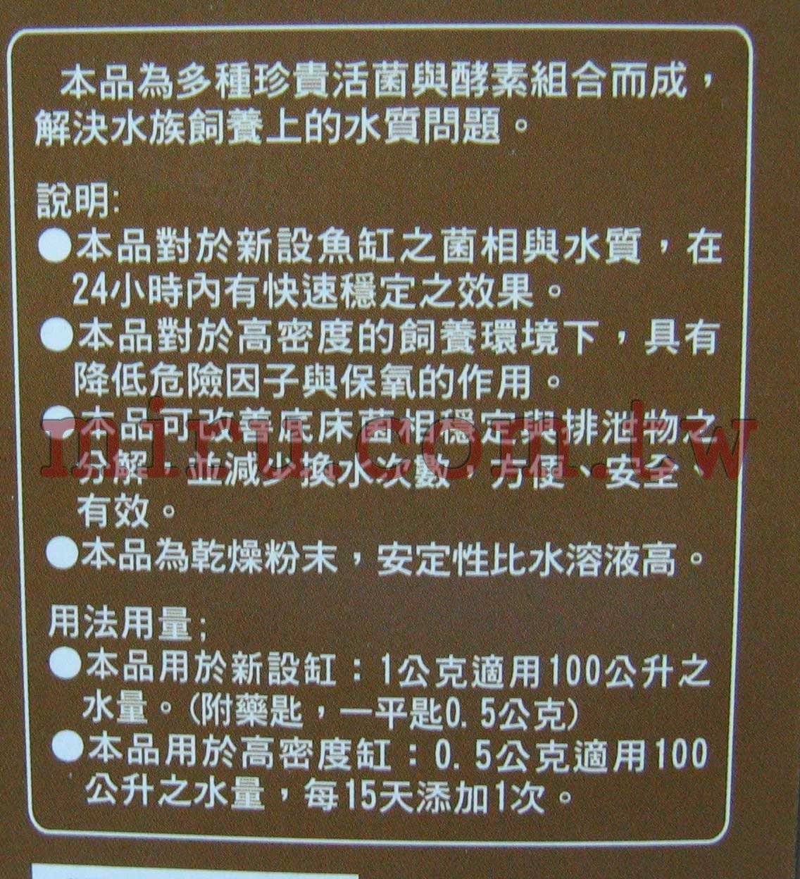 1. 多種珍貴活菌與酵素組合而成,解決水族飼養上的水質問題。