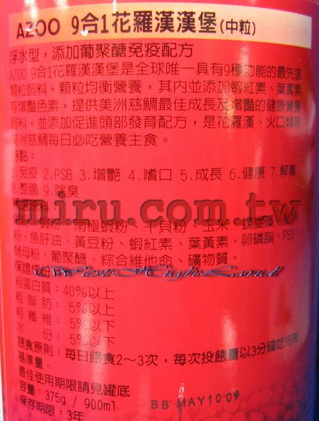適用於花羅漢、火口類等美洲慈鯛 AZOO 9合1花羅漢漢堡是全球唯一具有9種功能的最先進顆粒飼料, 顆粒均衡營養,其內並添加蝦紅素、葉黃素等增豔色素, 提供美洲慈鯛最佳成長及增豔的健康營養飼料, 並添加促進頭部發育配方,是花羅漢、火口類等美洲慈鯛 每日必吃營養主食。 |