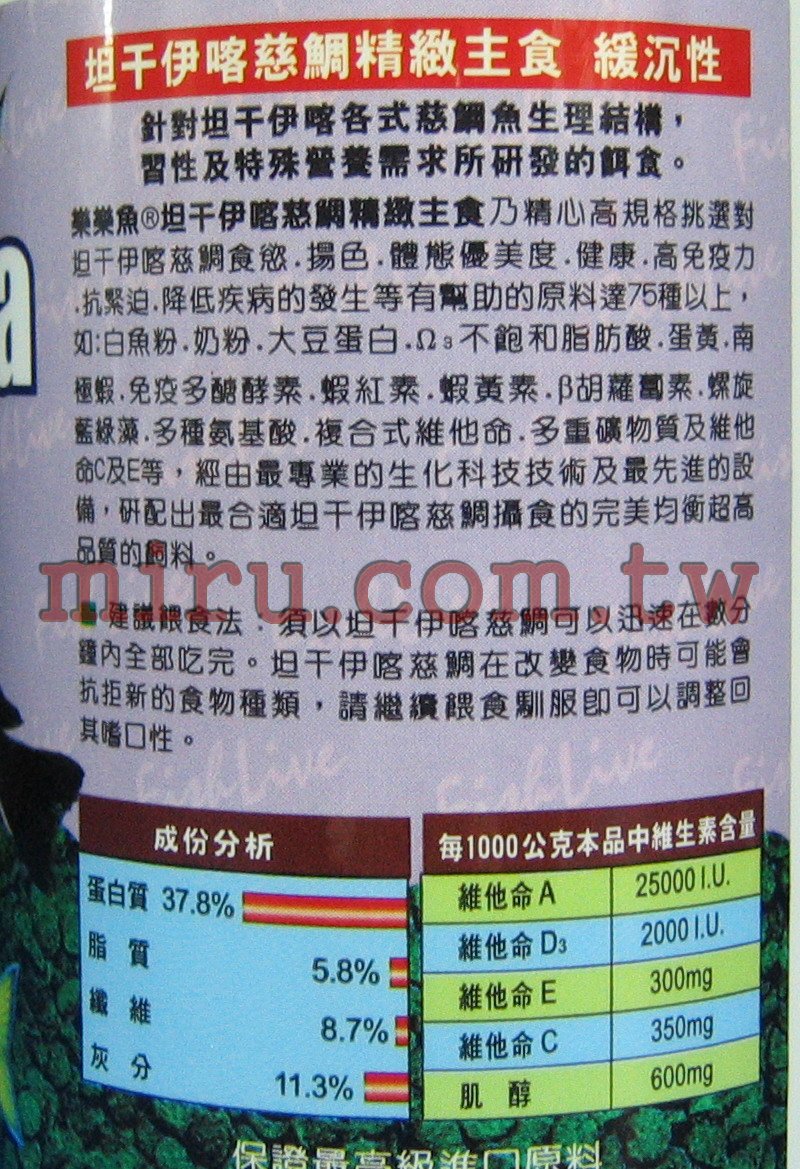 樂樂魚坦干伊喀慈鯛精緻主食,乃精心高規格挑選對坦干伊喀慈鯛食慾、 揚色、體態優美度、健康、高免疫力、抗緊迫、降低疾病發生... 等有幫助的原料達75種以上,如:白魚粉、奶粉、大豆蛋白、Ω3不飽和脂肪酸、 蛋黃、南極蝦、免疫球多醣酵素、蝦紅素、蝦黃素、β胡蘿蔔素、螺旋藍綠藻、 多種氨基酸、復合式維他命、多重礦物質及維他命C及E...等, 經由最專業的生化科技術及最先進的設備, 研配出最適合坦干伊喀慈鯛攝食的完美均衡超高品質飼料。 |