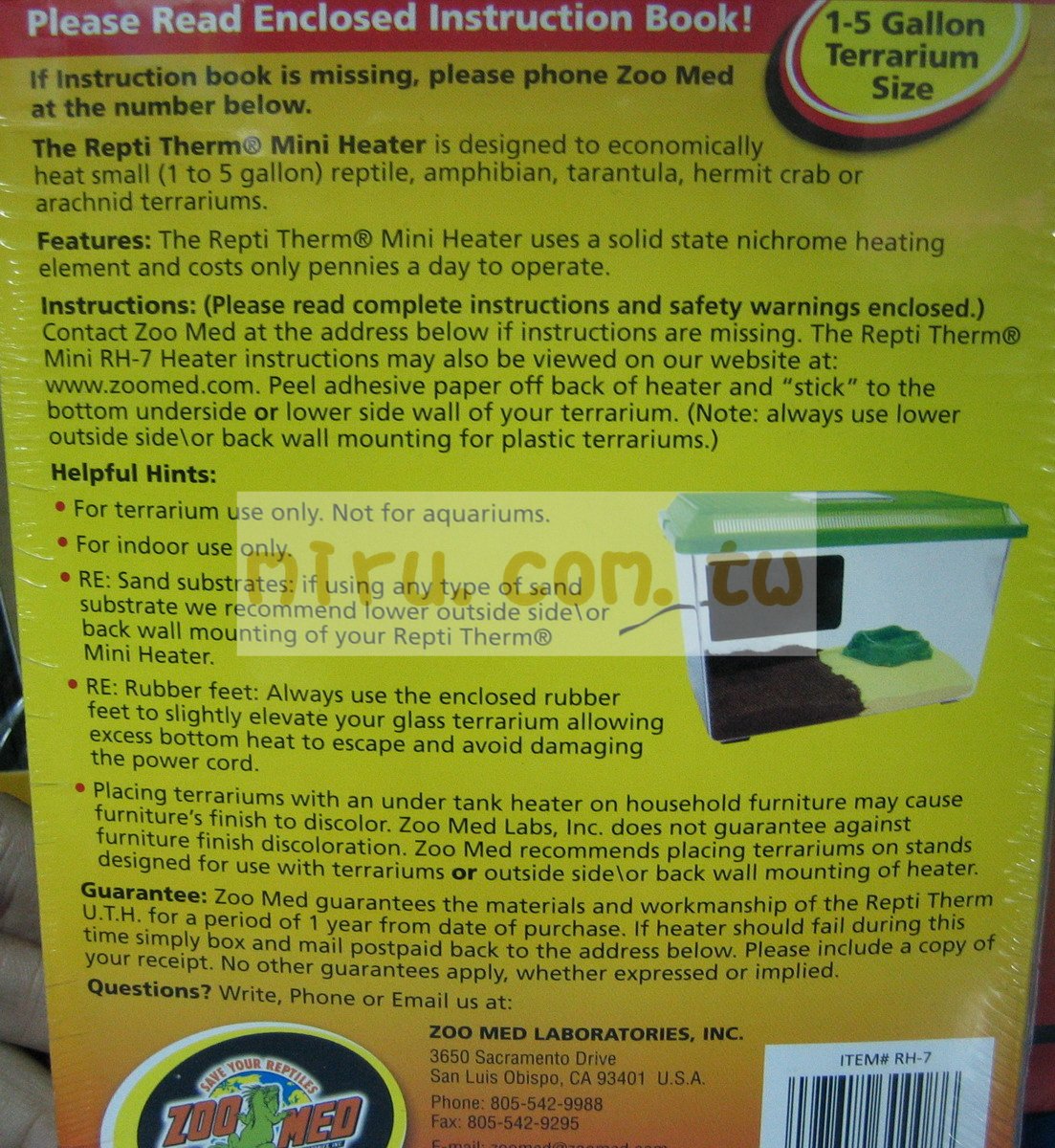 UL/CUL(歐洲GS/TueV/CE)認證,含固態鎳熱元素,可永久黏附在飼養箱,具有防水及耐刮作用;可搭配溫度調節器來提供熱帶或溫帶爬蟲動物使用,是理想的24小時熱能來源。 |