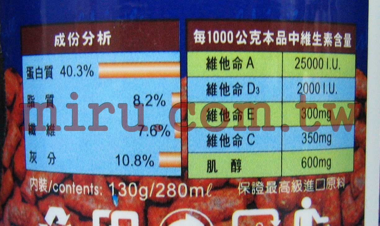 樂樂魚花羅漢精緻主食, 乃精心高規格挑選對花羅漢食慾、揚色、體態優美度、健康、 高免疫力、抗緊迫、降低疾病發生...等有幫助的原料達75種以上, 如:白魚粉、奶粉、大豆蛋白、Ω3不飽和脂肪酸、蛋黃、 南極蝦、免疫球多醣酵素、蝦紅素、蝦黃素、β胡蘿蔔素、 螺旋藍綠藻、多種氨基酸、復合式維他命、 多重礦物質及維他命C及E...等, 經由最專業的生化科技術及最先進的設備, 研配出最適合花羅漢攝食的完美均衡超高品質飼料 |
