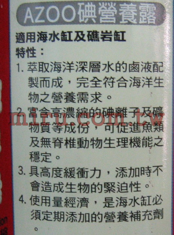 > 海水相關用品 > 海水魚飼料、營養劑/軟體飼料、營養劑 > AZOO 碘添加劑、營養露(500ml)新包裝新配方