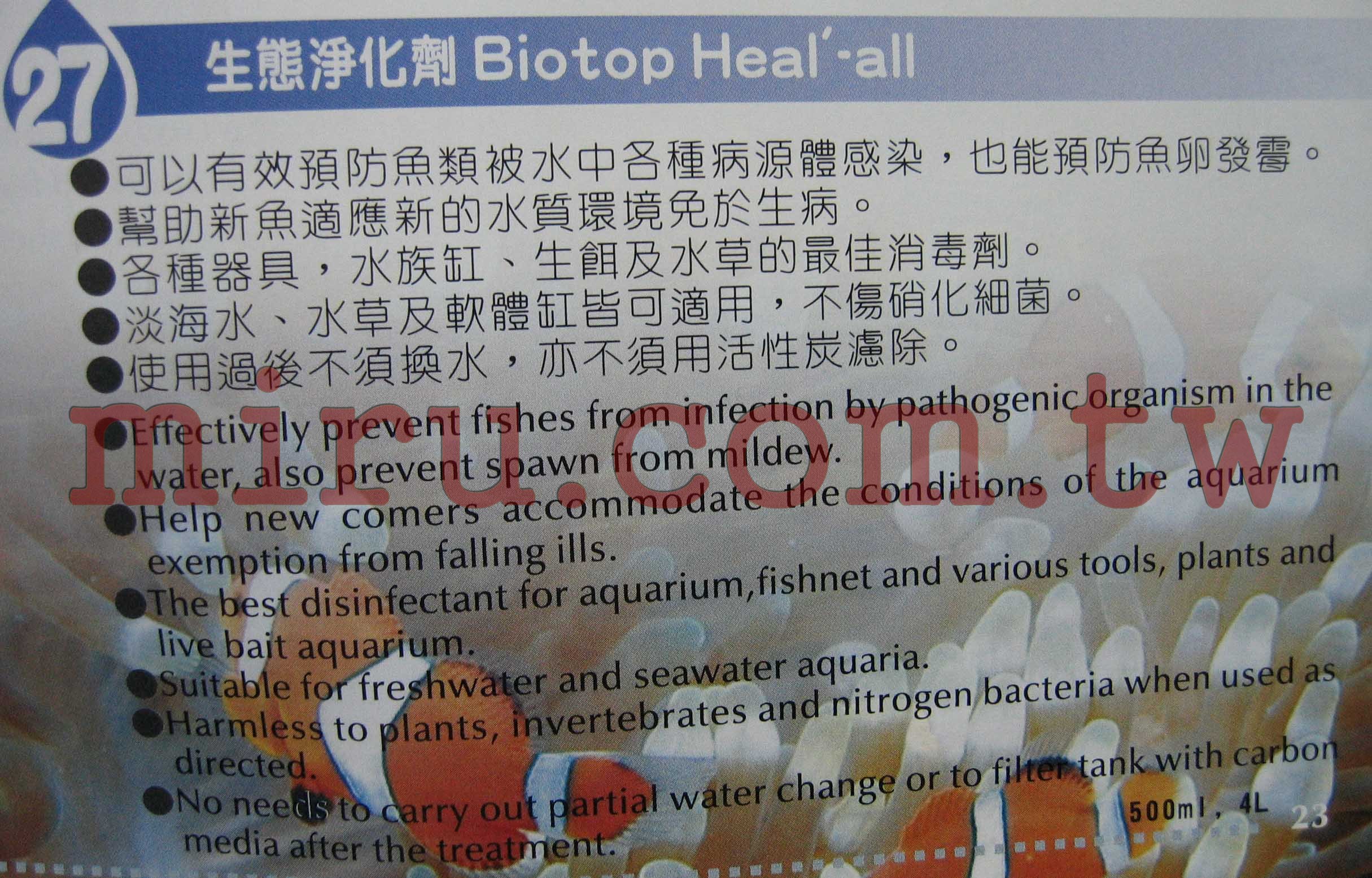 可以有效魚類被水中各種病原體感染,能預防魚卵發霉 幫助新魚適應新的環境免於生病 各種器具,水族缸,生餌及水草的最佳消毒劑 淡.海水皆可使用,不傷害硝化細菌 使用過後不須換水,不需用活性碳濾除。