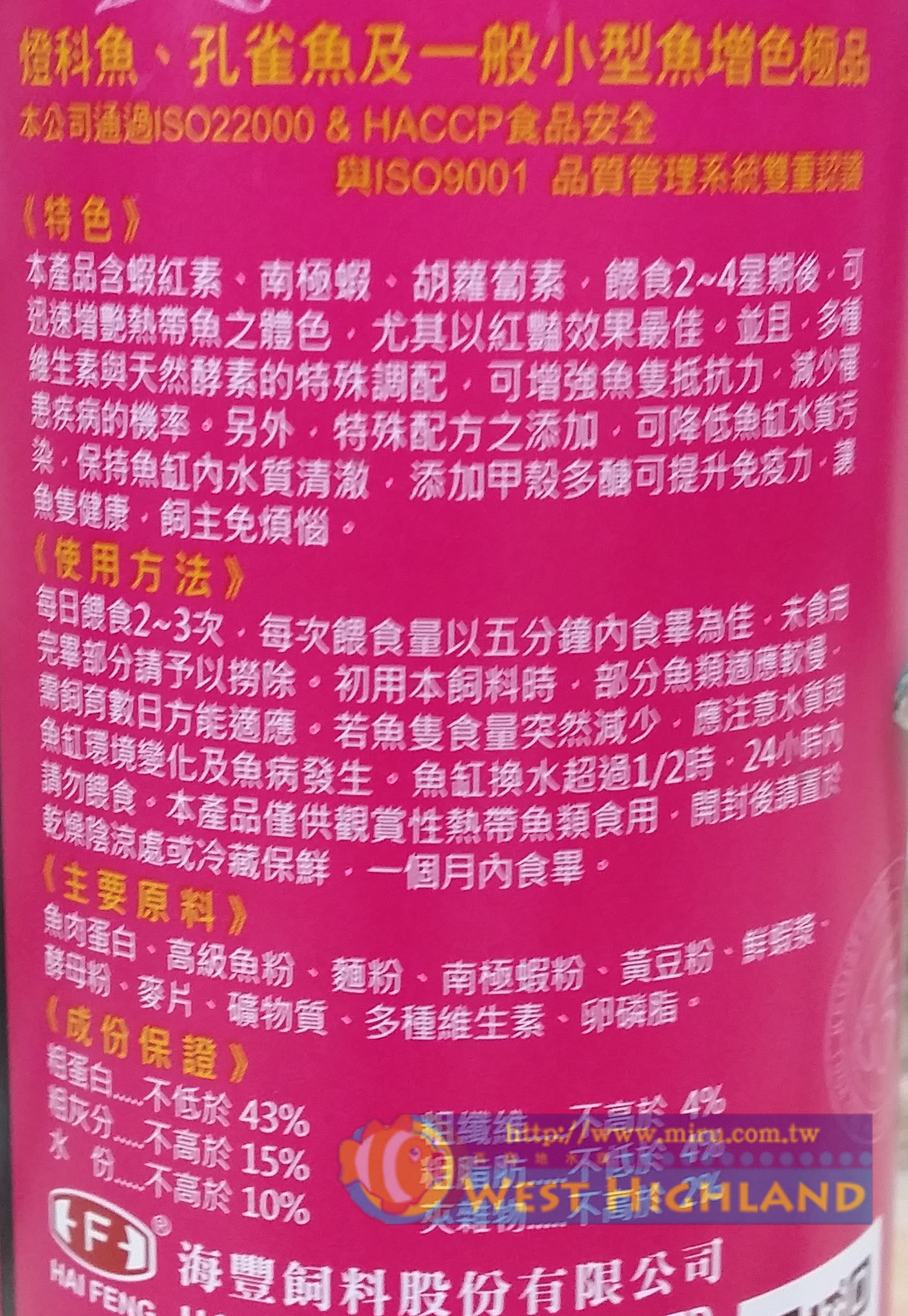 1本飼料可迅速增紅熱帶魚之體色,尤其以血鸚鵡效果最佳。 一般血鸚鵡成長後體色若為淺紅、橘紅或微紅時, 食用本飼料一星期左右即可轉變為大紅之體色,極為鮮豔美麗 血鸚鵡有時因換水,改變環境造成之褪色時,食用本飼料亦有極佳之效果。 ,且可增強抵抗力,減少疾病罹患。 體色便明顯增加美麗鮮豔。 主要原料: |
