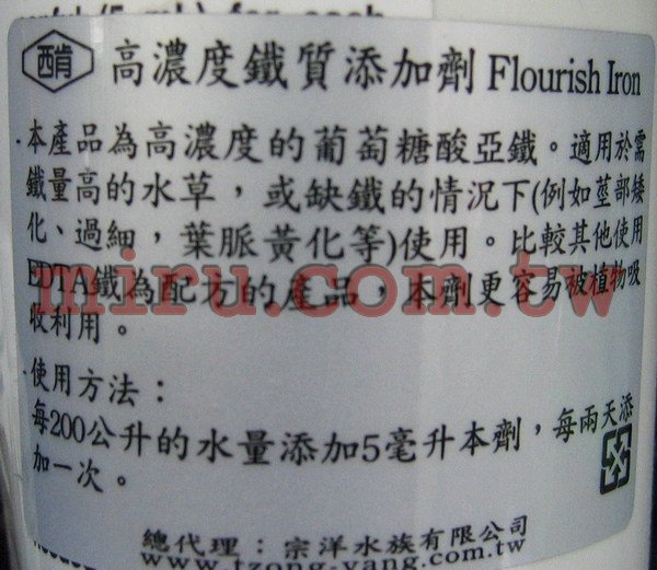 本劑適用於需鐵量高的水草水族箱,或缺鐵的情況下(例如莖部矮化、過細,葉脈黃化等)使用。 相較於EDTA鐵為配方的產品,本劑更容易被植物吸收利用,因為EDTA鐵為正三價的鐵離子(Fe3+)。 植物在利用EDTA鐵時,需花費更多的能量將鐵離子從EDTA中分離出來,並且將三價鐵(Fe3+)轉換為二價鐵(Fe2+)才能利用。 因此本產品提供植物最佳的鐵元素。 本產品不含磷酸鹽、硝酸鹽。 使用方法:每200公升的水量添加5毫升本劑,依照不同水草種植的情形,可每天或兩天添加一次,建議測量水中的鐵離子,使水中的鐵離子濃度保持在0.1ppm。 亦可觀察植物的生長情形來使用,缺鐵時,植物的新芽會有葉綠素缺乏(顏色黃化)的情形,莖部也會有矮化、過細的症狀。 特點: 葡萄糖酸亞鐵(Fe2+)狀態較為穩定,且較易於植物吸收;市面上的EDTA鐵配方植物則須耗費較大能量將鐵離子分離出來才能吸收 |
