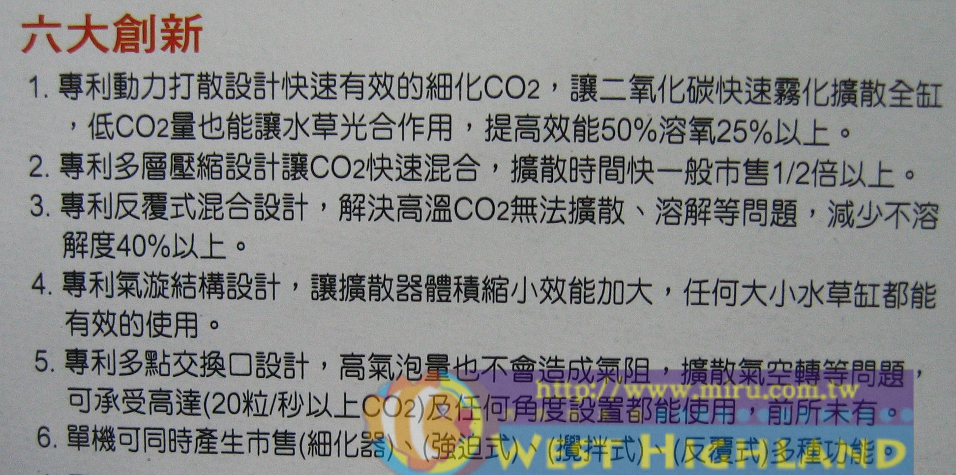 專利動力打散設計快速有效的細化CO2,讓二氧化碳快速霧化擴散全缸, 低CO2量也能水草光合作用,提高效能50%、溶氧25%以上。 專利多層壓縮設計, 讓CO2快速混合,擴散時間快一般市售2倍以上。 專利反覆式混合設計,解決高溫CO2無法擴散,溶解等問題, 減少不溶解度40%以上。專利氣漩結構設計,讓擴散器體積縮小效能加大, 任何大小草缸都能有效的使用。 專利多點交換口設計,高氣泡量也不會造成氣阻,擴散氣空轉等問題, 可承受高達(20粒/秒以上CO2)及任何角度設置都能使用,前所未有。 單機可同時產生市售細化器、強迫式、攪拌式、反覆式多種功能。 |