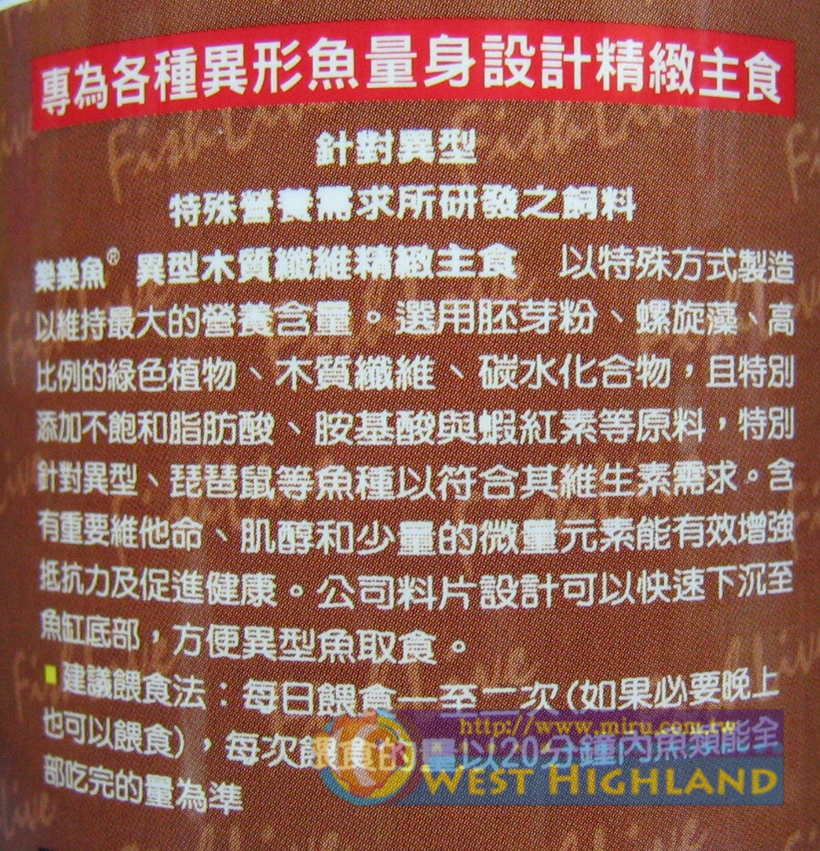 針 對營養需求所研發之飼料,以特殊方式製造以維持最大的營養含量。 選用胚芽粉、螺旋藻、高比例的綠色植物木質纖維、碳水化合物, 且特別添加不飽和脂肪酸、胺 基酸與蝦紅素等原料,特別針對異型、琵琶鼠等魚種以符合其維生素需求。 含有重要維他命、肌醇和少量的微量元素有效增強抵抗力及促進健康。沉底的的設計,方 便異型魚取食。 |