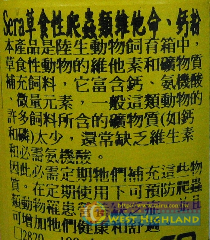 本產品是陸生動物飼育箱中,草食性動物的維他素和礦物質補充飼料, 它富含鈣、氨機酸、微量元素,一般這類動物的許多飼料所 含的礦物質太少。 本產品是專門為了給牠們添加鈣及其他礦物質研製而成,它富含維生素,必需氨機酸、微量元素。 在定期使用下可預防爬蟲類動物罹患營養缺乏 症,並且可促進牠們的新陳代謝及肌肉生長。 |