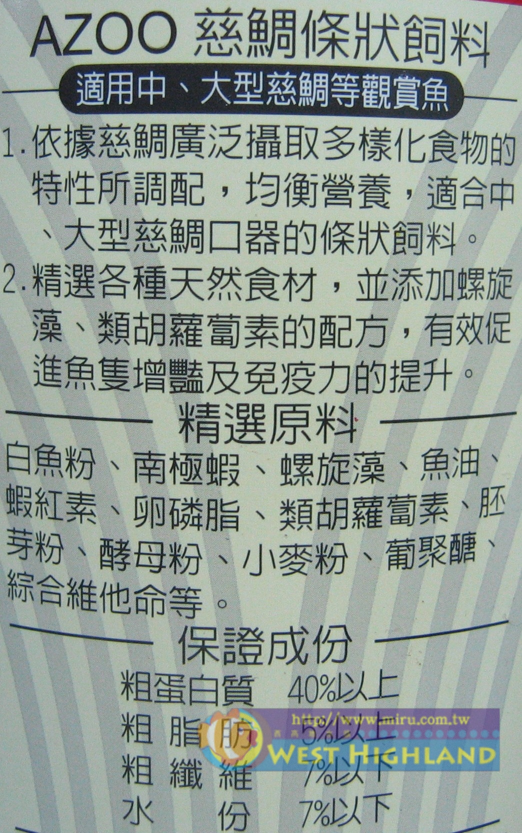 適合中、大型慈鯛等觀賞魚 浮水型,添加葡聚醣免疫配方1.依據慈鯛廣泛攝取多樣化食物的特性所調配,均衡營養,適合中、大型慈鯛口器的條狀飼料。