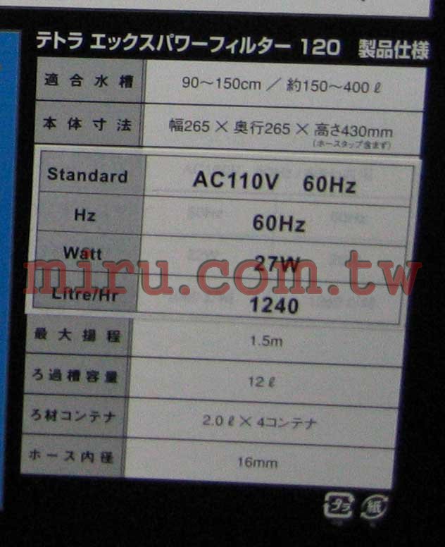 適用水量 : 150~400(L)~約3~4尺缸 出水量(L/hr) : 1240(L/H) 揚程(M) : 1.5(M) 出入水管徑 : 16/22mm 尺寸 : 26.5cm*26.5cm*高43cm 濾材容量 : 12(L) ~ 濾槽2(L)4層 耗電量 : 27(W) |